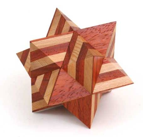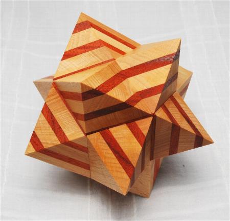 This is another of my designs, and another modification of one of the puzzles previously designed by Stewart Coffin. The idea for this puzzle was stuck in my mind for a long time, but was never made due to the simplicity of the idea. However, all who have seen the puzzle have found it to be a pleasing design with an unexpected solution. What made the design finally go though was the combination of laminated wood pieces with the design - the laminations being another idea in my mind for a long time...