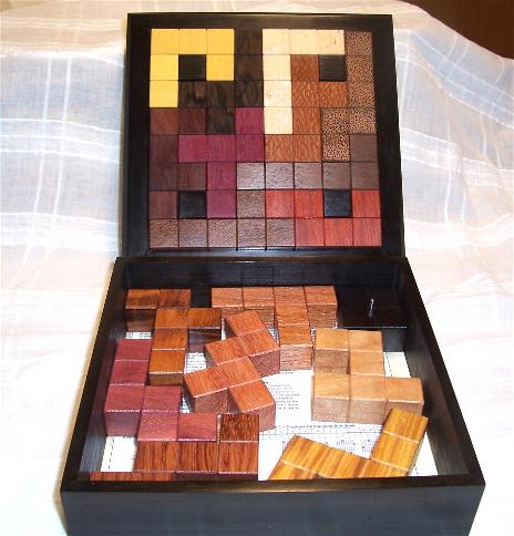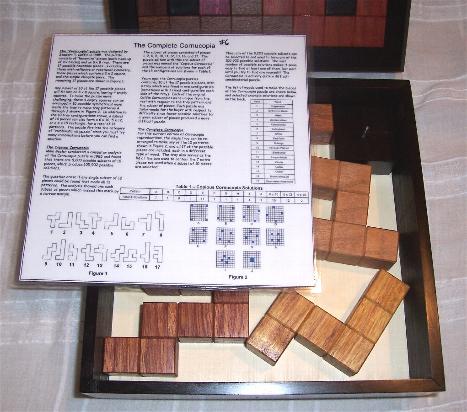 This is the first puzzle modification/design by Scott - but really a straightforward modification of the Cornucopia puzzle designed by Stewart Coffin. Years ago Stewart made 2-sided trays for the Cornucopia puzzles (single different fixed board arrangement each side), and 10 of the 17 possible pieces came with the puzzle. However, there are 10 possible board arrangements. The Complete Cornucopia is a version that makes all 10 board arrangements possible with a single tray, and all 17 possible pieces are included. Each piece is made from a different type of colorful exotic wood.